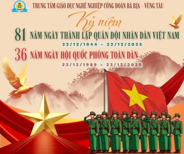 Chúc mừng kỷ niệm 81 năm Ngày thành lập Quân đội nhân dân Việt Nam (22/12/1944 – 22/12/2025) và 36 năm Ngày hội Quốc phòng toàn dân (22/12/1989 – 22/12/2025), Trung tâm giáo dục nghề nghiệp công đoàn Bà Rịa – Vũng Tàu xin trân trọng gửi những lời chúc mừng tốt đẹp nhất đến các cán bộ, chiến sĩ đã và đang cống hiến tuổi xuân, trí tuệ và cả cuộc đời mình cho sự nghiệp bảo vệ Tổ quốc.
