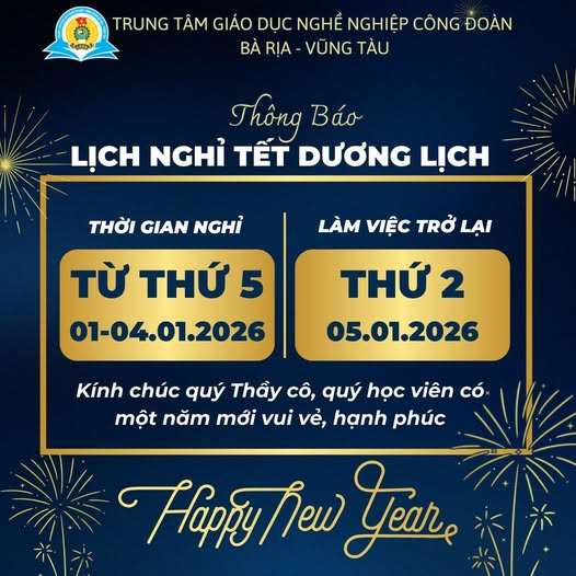 Trung tâm Giáo dục nghề nghiệp Công đoàn BR – VT xin trân trọng thông báo lịch nghỉ Tết Dương lịch như sau: